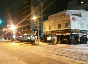 匆匆转了一圈就继续往狸小路商店街的方向闲逛,沿路上还能看到被雪覆盖的有轨电车站: