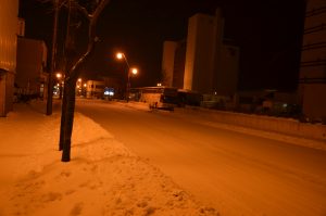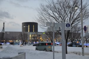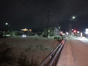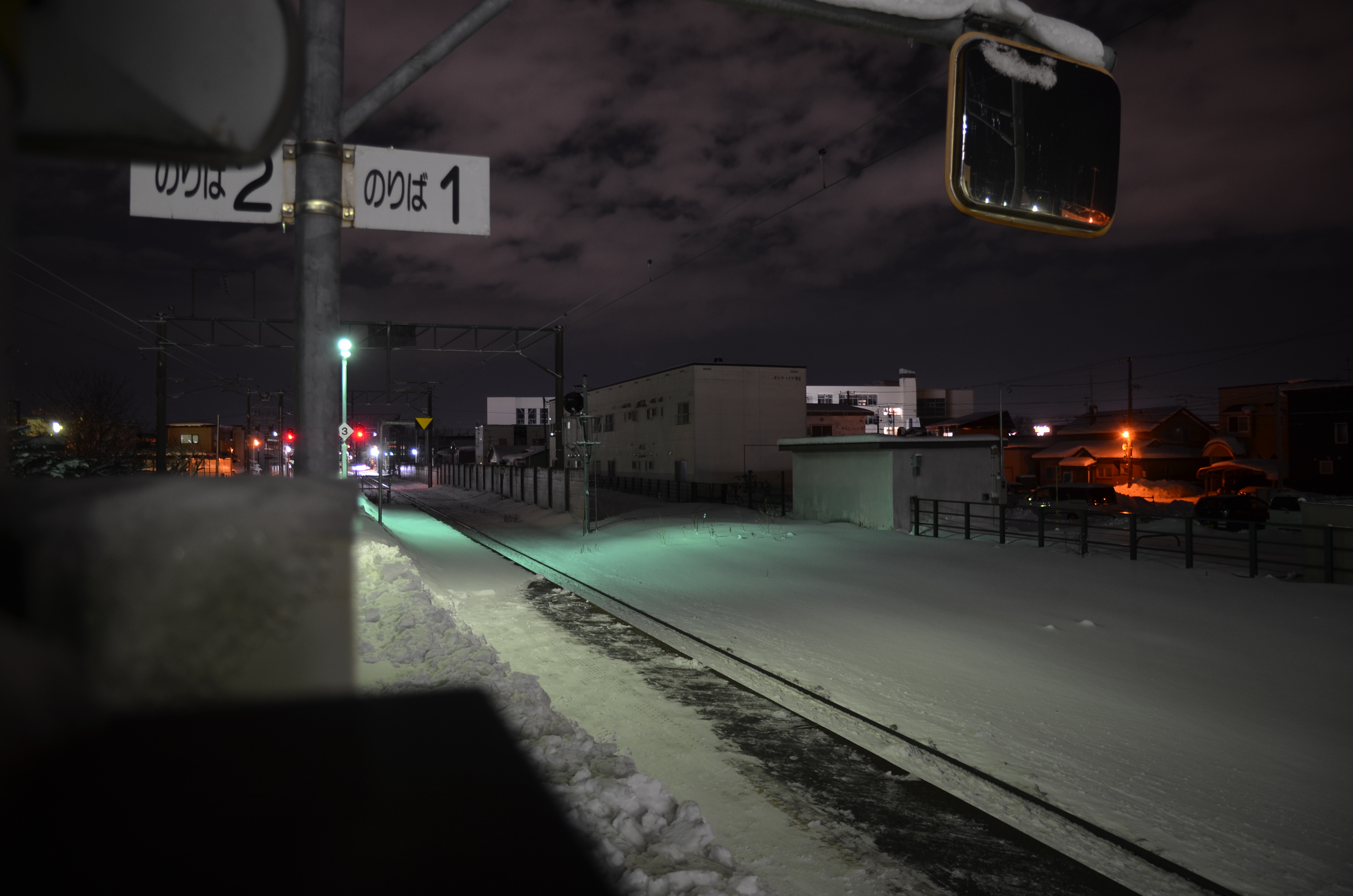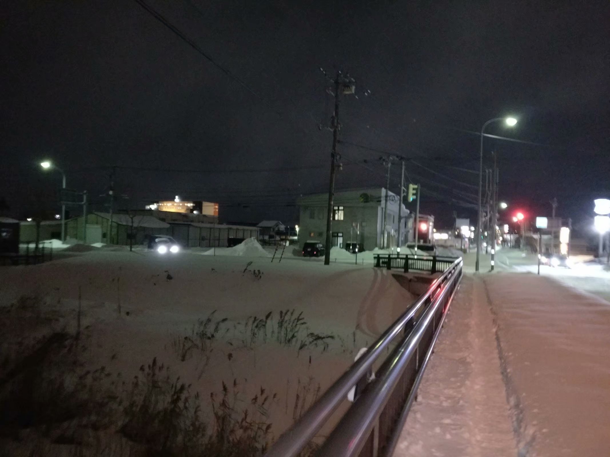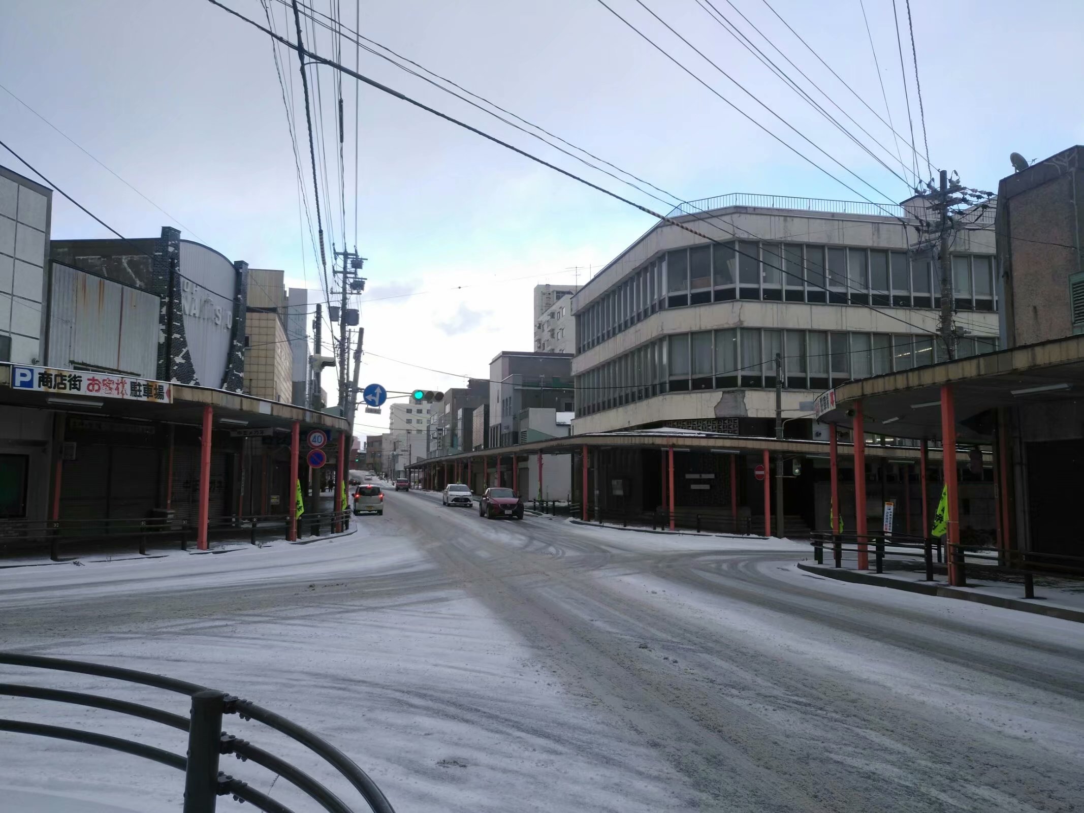 错过了函馆山,晚上决定找点事情干。于是找了一下离的最近的机厅想出个勤,发现机厅在郊区,于是从函馆站买了电车票直奔过去,下车发现还要走两公里…这一片全是平房,从镇子里走了两公里雪路才到达。从远处望去,机厅那个屋顶就像沙漠里的佩特拉一样壮观。