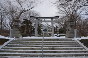 吃完中午饭,天空开始飘起了小雪。沿着台阶开始攀登室兰最高峰测量山。路上还经过了一个八坂神社。