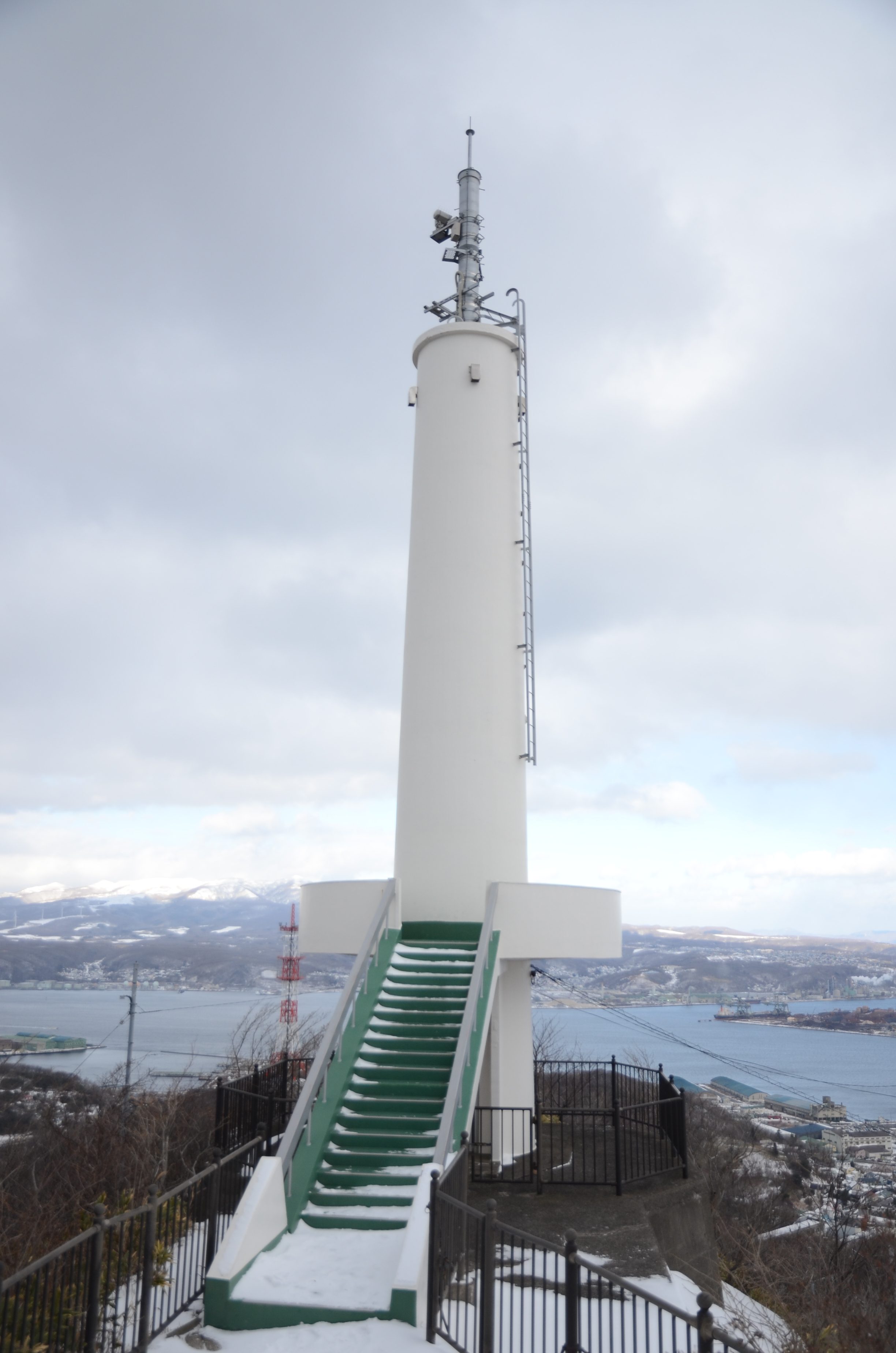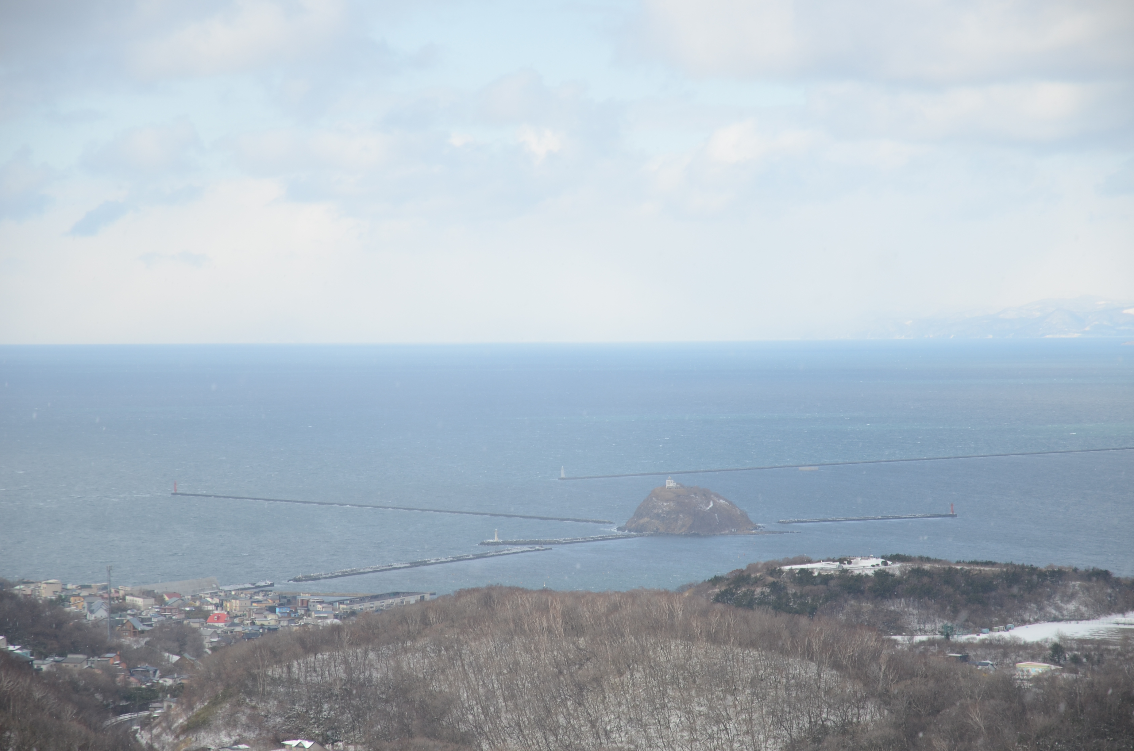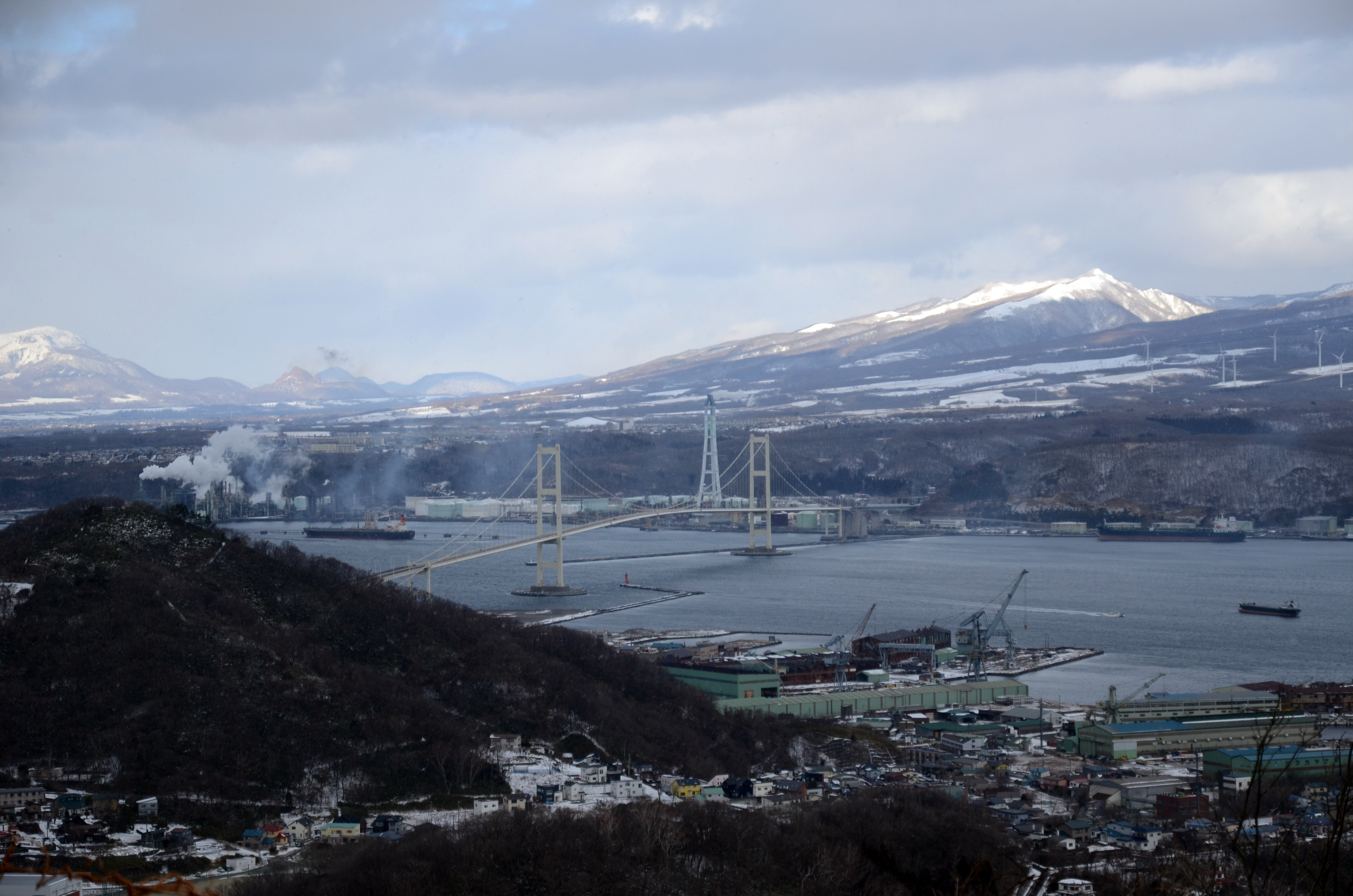 沿着神社继续往上走,经过一段盘山公路,就到达了测量山山顶。从山顶俯瞰,可以看到室兰的标志性建筑物白鸟大桥。往另一边看去,就是辽阔无边的北太平洋。