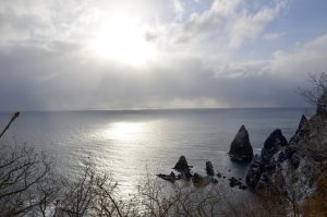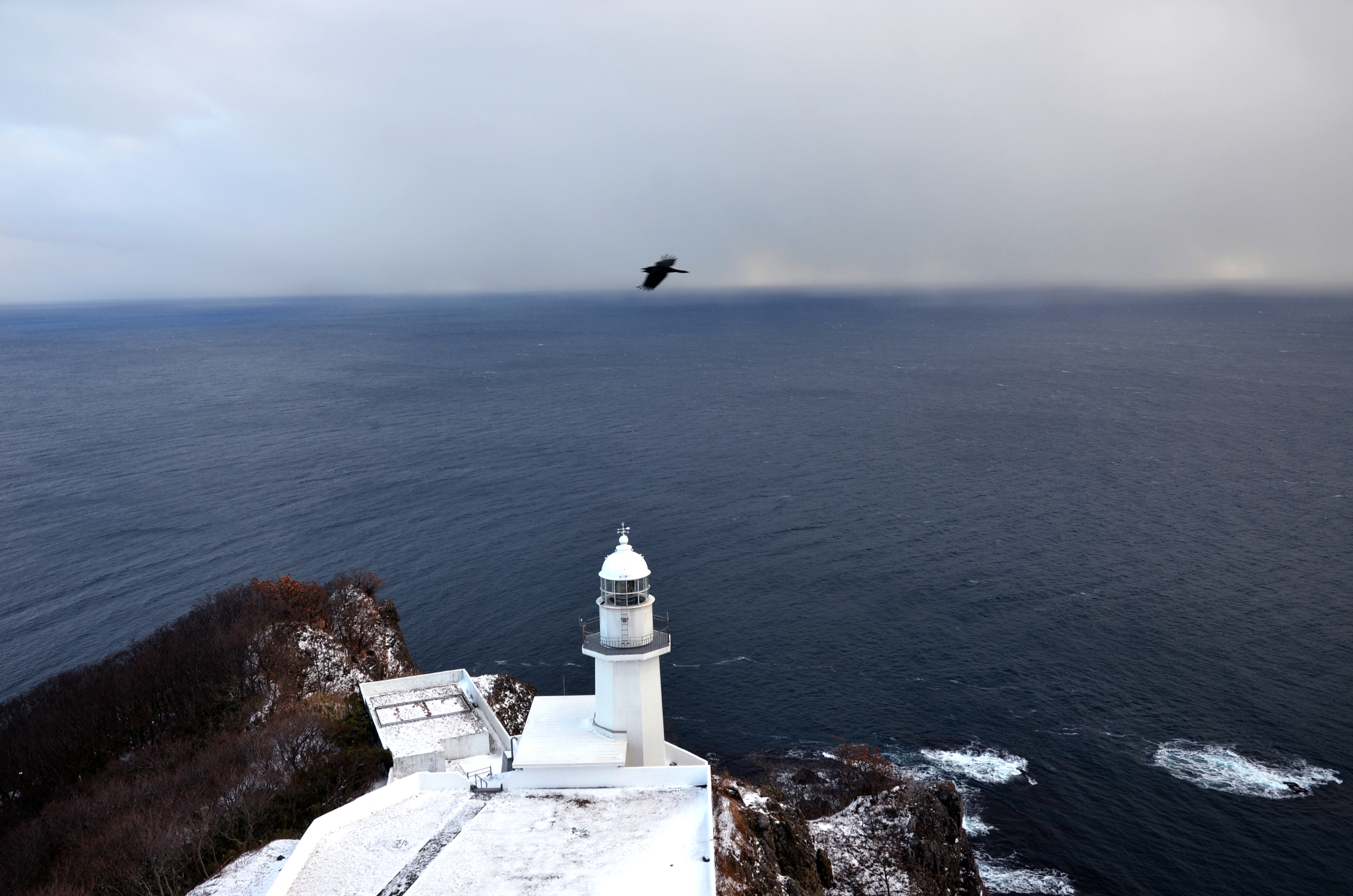 翻过了最后一个山口,远远能看到游客大巴,我知道我抵达目的地了。从地球岬展望台看去,地球的弧度一收眼底,偶尔有海鸟掠过灯塔,更是平添了几分壮观。地球岬展望台上有一口幸福之钟,经常有恋人面对着大海来敲响这口钟,让白雪和大海来见证这份浪漫。