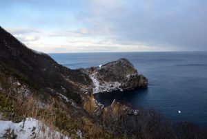 到达地球岬时候已经是下午四点多了,在山上停留了一阵子,就开始下山。室兰市标准的山城,沿着漫长的下坡,两边分布着很多的屋子。路上还经过了金屏风展望台,仿佛一道屏风直插海中。