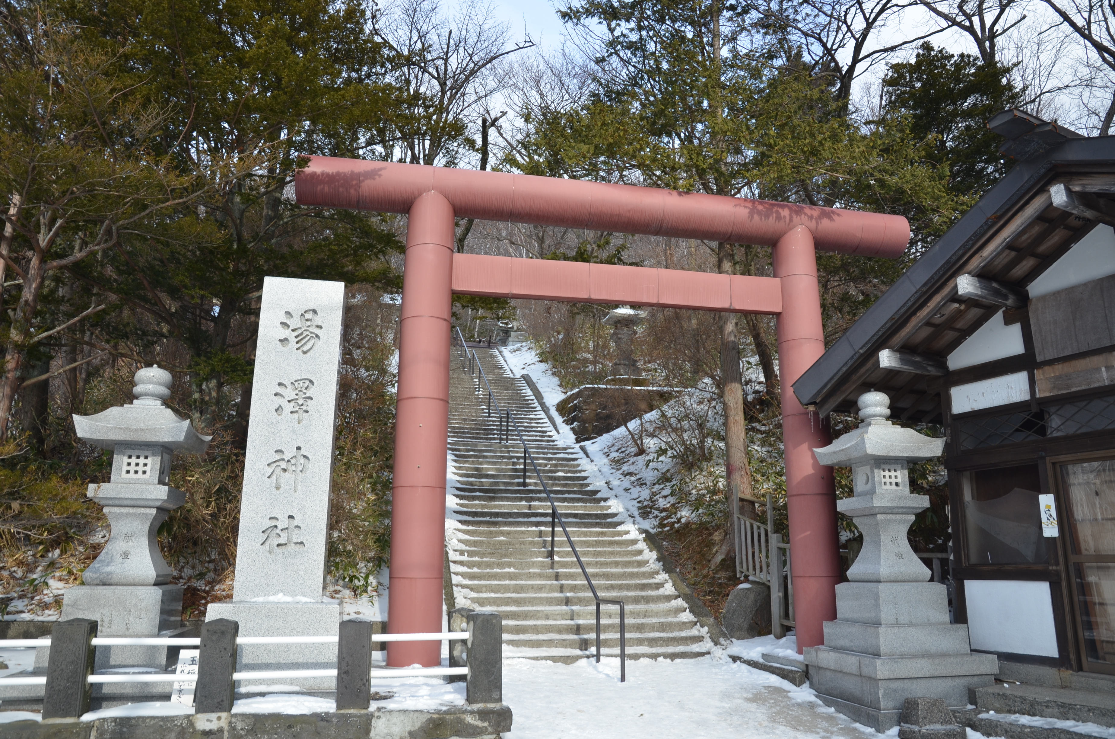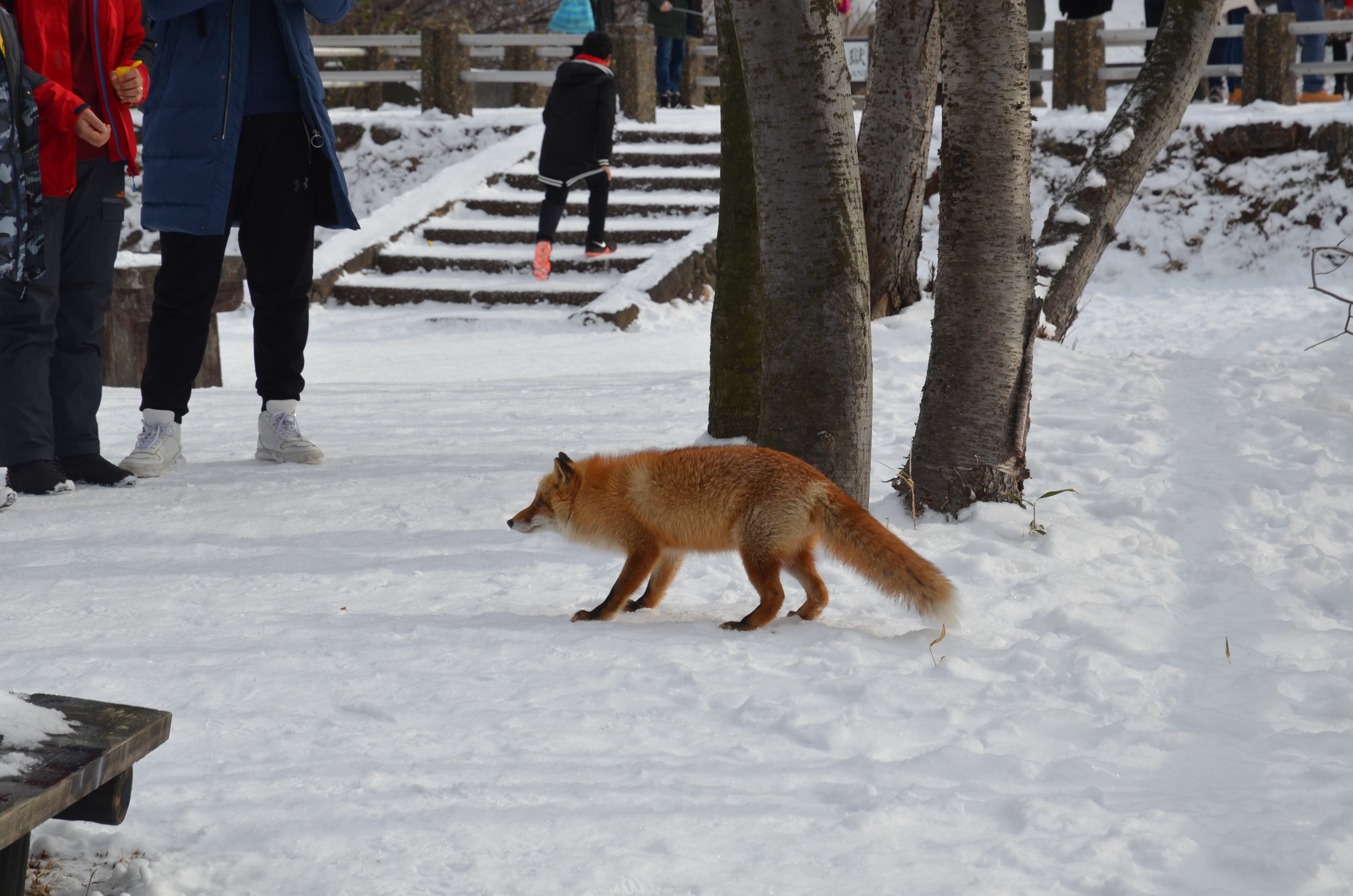 从山上下来以后,在山下的汤泽神社站了一会,偶尔还有狐狸从游客面前快速跑过。可能是大雪之后狐狸找不到吃的,就来找游客要。要到以后一溜烟就跑没影了。