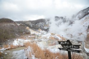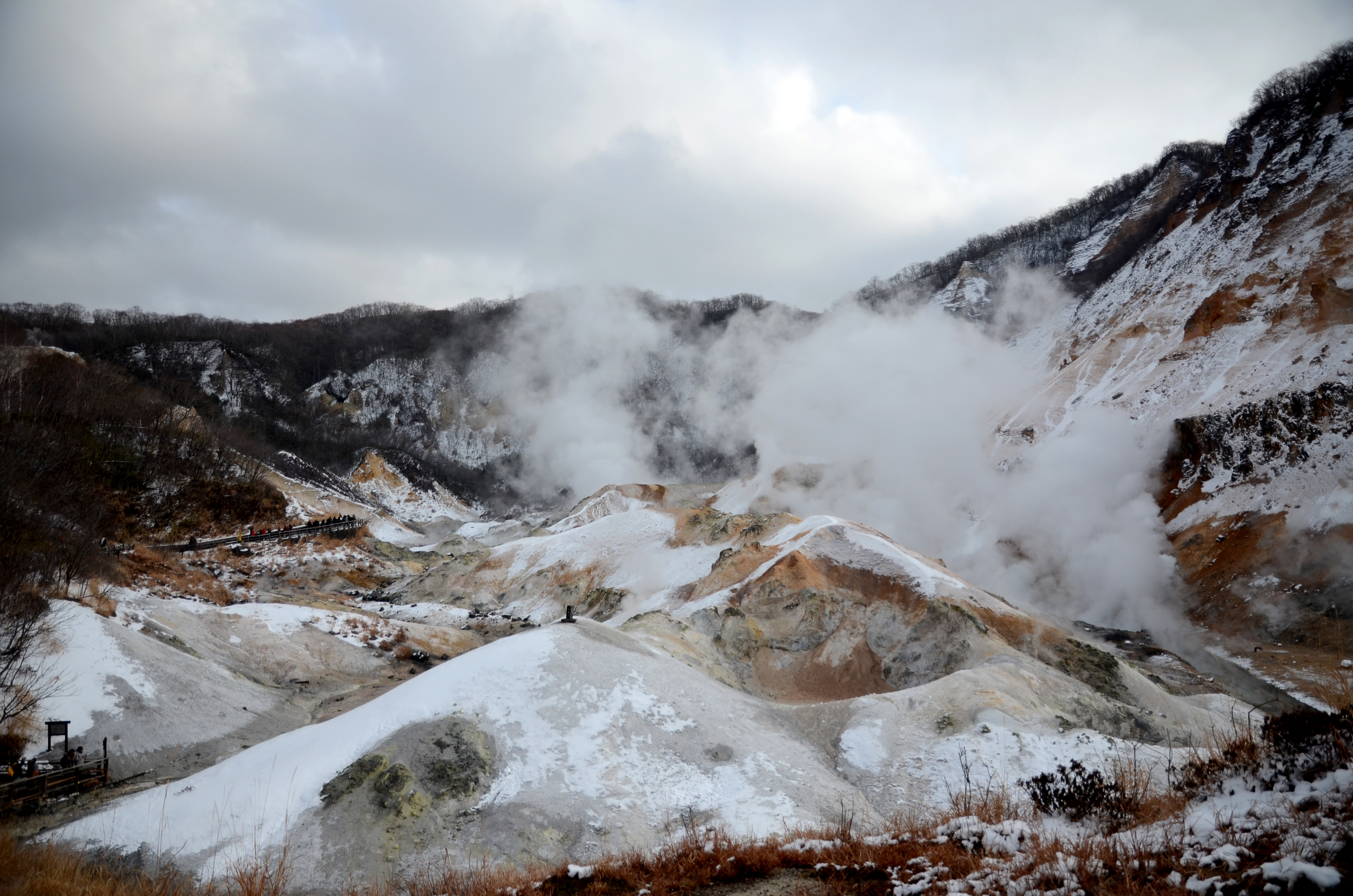一早起来就来到公交车站赶去登别的高速公交,一个多小时就到了登别地狱谷。一下车就闻到了一股浓重的硫磺味道。登别有温泉乡之称,保留着很多火山活动的产物。登别地狱谷是本地最有名的自然景观,火山活动产生的高温使得谷内弥漫着热气,沸腾的泉水和天空飘着的小雪相映衬,平添一股壮美。太阳出来以后,谷内含有各种物质的岩石在阳光下呈现出五彩的斑斓。