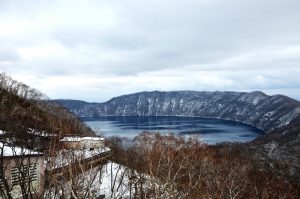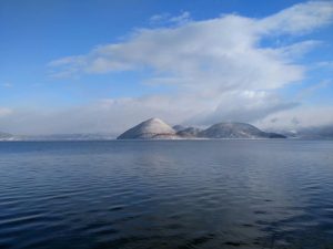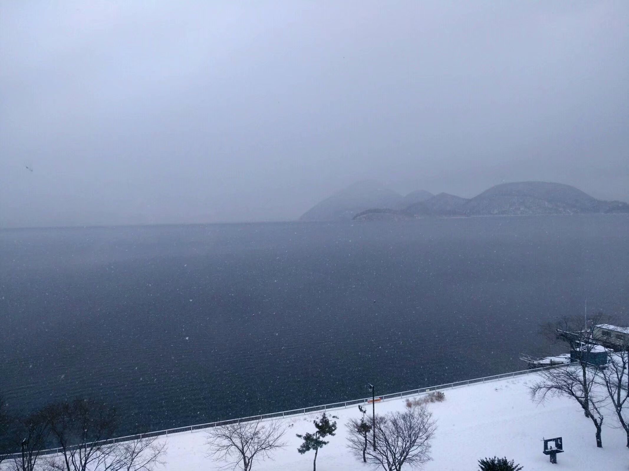 第四天起了个早,吃了个早饭就去赶去室兰的公交车。早上的洞爷湖还下着雪,从落地窗往外看一片雾蒙蒙。结果吃完早饭以后,天气突然放晴,湖对岸的远山清晰可见。