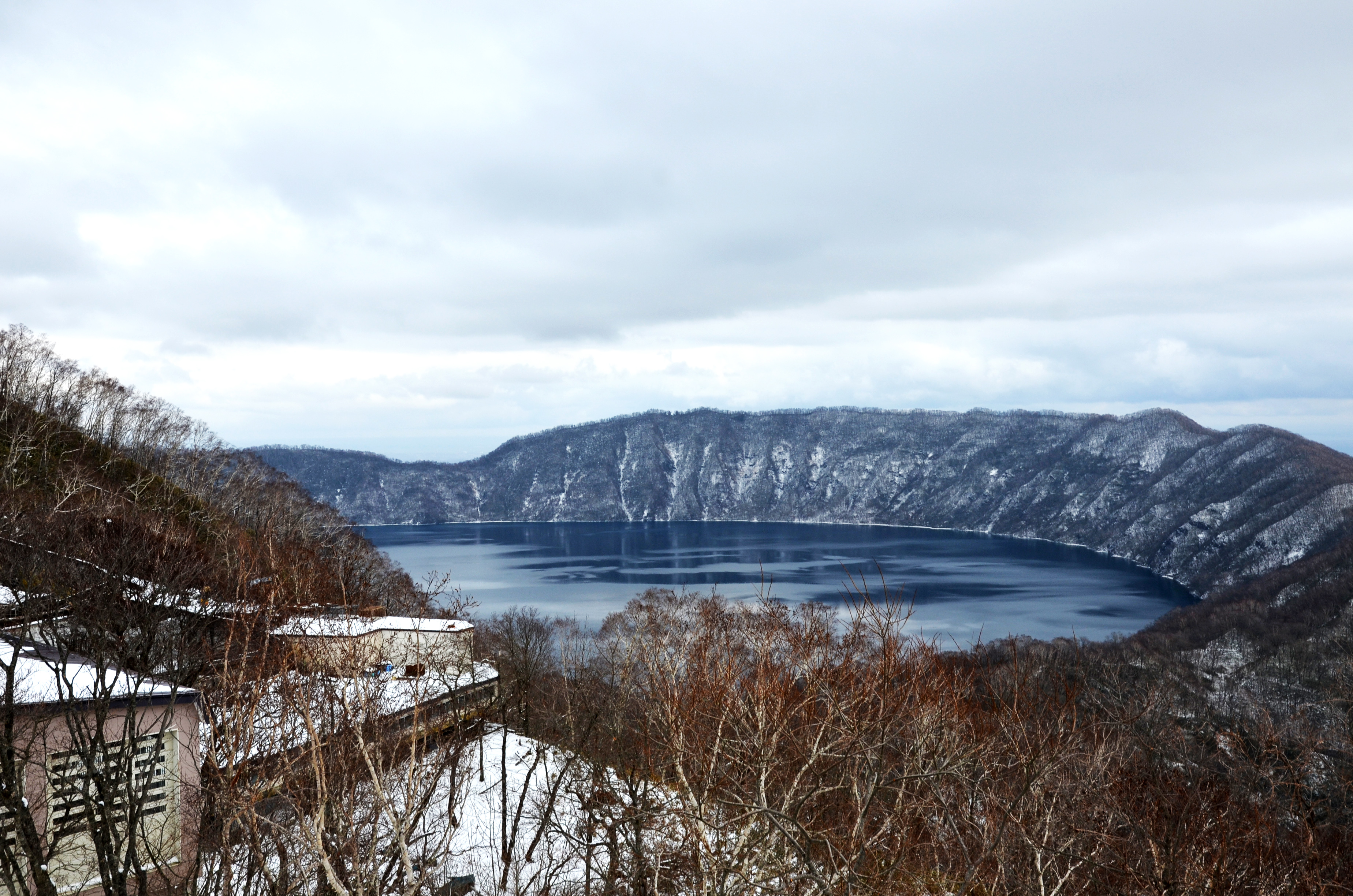 从熊牧场顶部的观景台可以看到登别的火山口湖——俱多乐湖。俱多乐湖是一个完美的圆形,湖水由于缺乏营养物质,基本没有生物,呈现出纯净的湖蓝色。