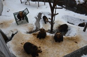 在地狱谷转了一圈,出来以后坐缆车可以直达山顶的熊牧场,这里可以隔着玻璃用一个投喂器给熊投喂。熊看上去很笨拙但是都非常灵活,从上面扔下去的食物熊基本上能全都接到,有人拿食物逗他玩时候还会伸出手主动要。