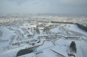 拉着行李箱去了函馆最有名的景点五棱郭公园。时间有限就没进去,只从公园旁边的五棱郭塔上俯瞰了一下整个公园的全貌。塔顶还能远眺整个函馆市区,还有土方岁三的雕像。在塔顶买了一些游客纪念品。