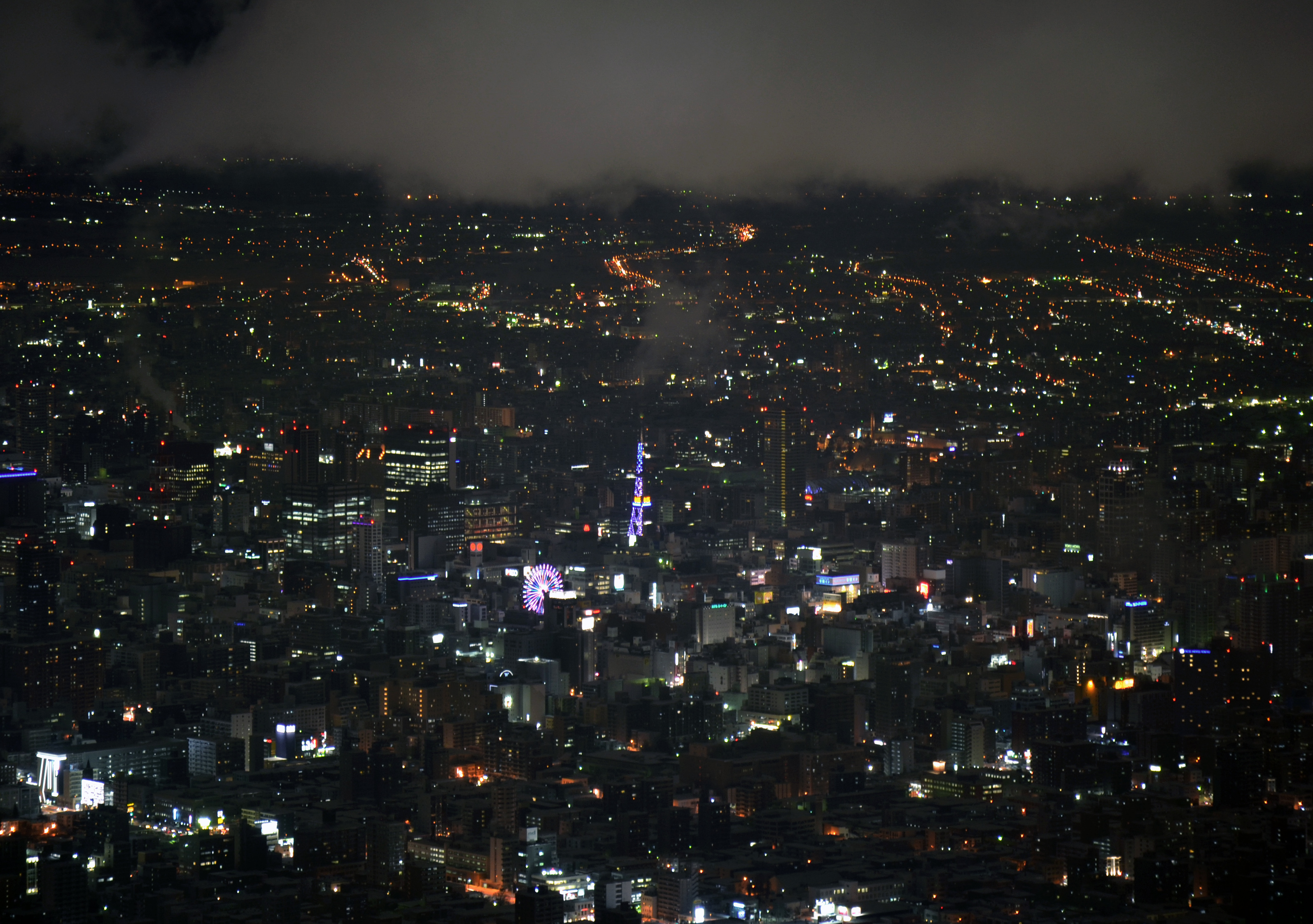 下午在酒店发呆的时候,偶然看到酒店的宣传册上有一个优惠券页,上面有札幌的所有夜景优惠券。看了一下感觉藻岩山的夜景也不错,错过了函馆山这次不能再错过了,于是立刻出发。从山下的接驳车到了半山腰,然后索道上山。天公作美,刚到山顶的时候雪刚停,能见度很高,于是赶紧拍了一张札幌的夜景: