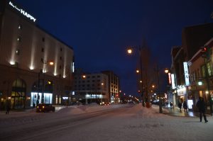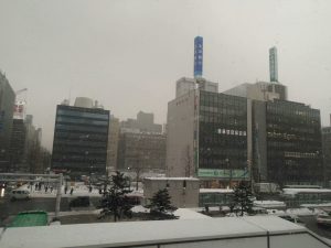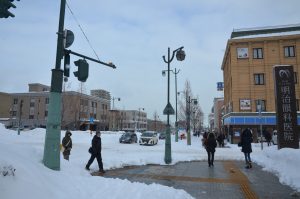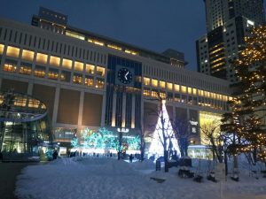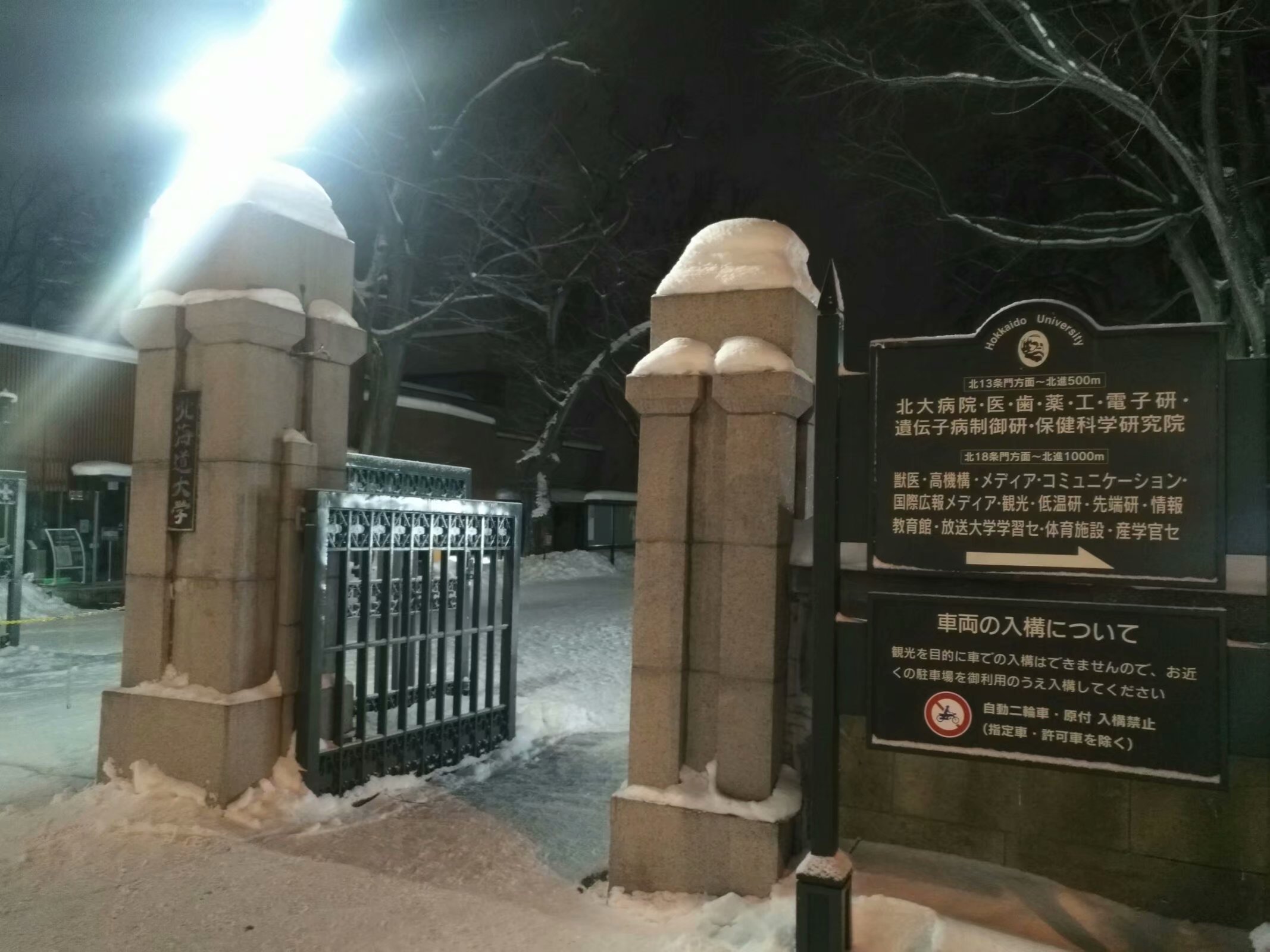 白天还是一直晴朗的天,到了接近晚上时候就开始飘起了雪花。从札幌站前出来以后,鹅毛大雪倾泻而下。但是既然来了总不能走回头路,于是决定横穿一下北海道大学。北海道大学校园里还是很好看的,有一点东北大学的那种感觉。在校园里走的路上还遇到了大雪里推销笔的实习生,太敬业了…