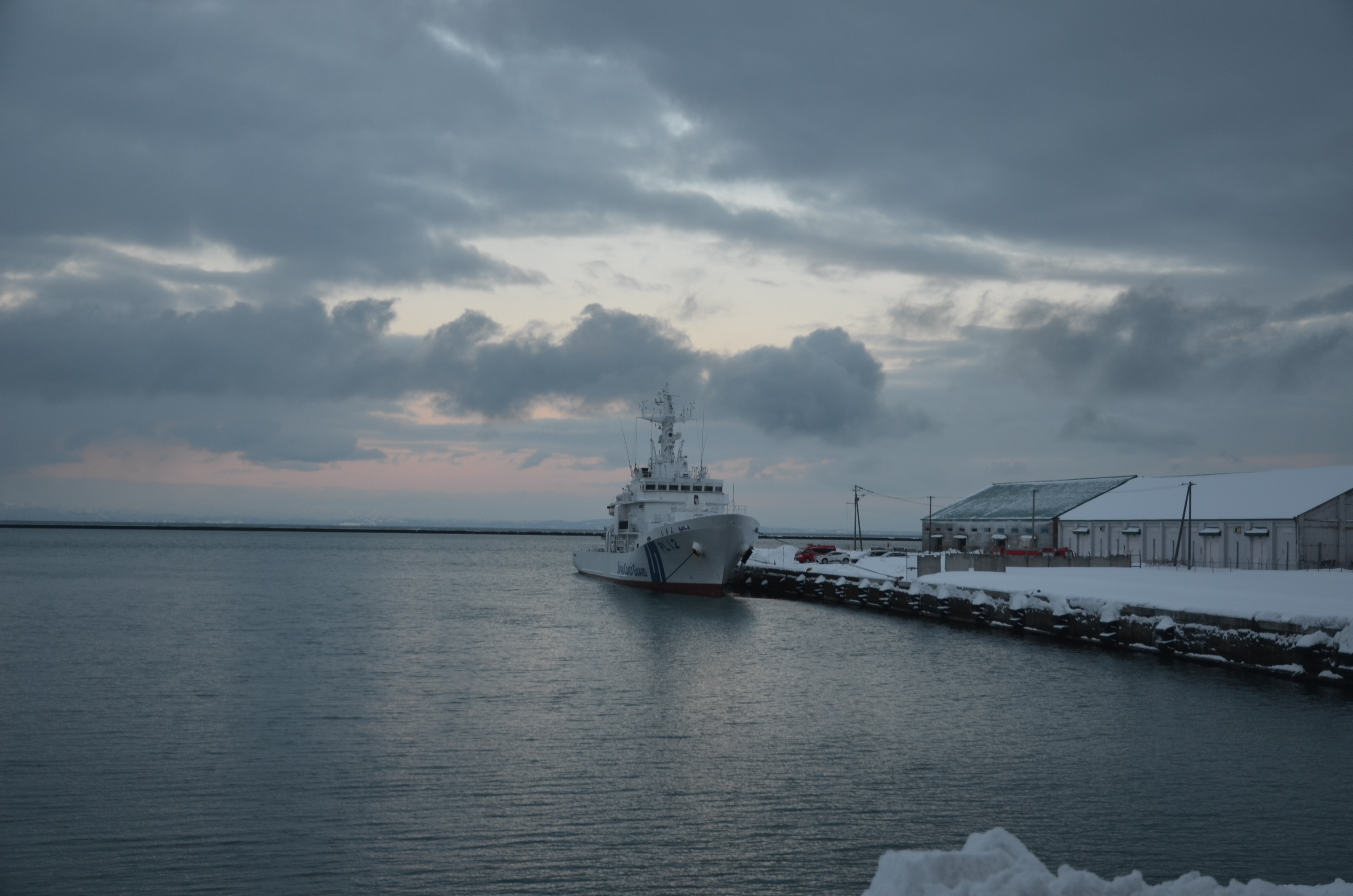 吃完了拉面,回到了小樽港。这时候已经是黄昏时分,夜幕即将降临的小樽港十分安静,只有船只在海面上随波起伏。这时候开始下雪了,爬上小樽港的一个两层楼高的雪堆,记录下了落日时分的港口: