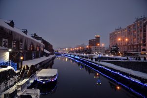 夜幕降临,小樽华灯初上。这时候雪还在下,雪花在空中折射着绚烂的灯光,让小樽运河的多彩多了一分迷离感。游人们在河边漫步,欣赏着这刚入夜的美景。