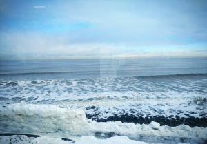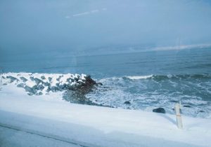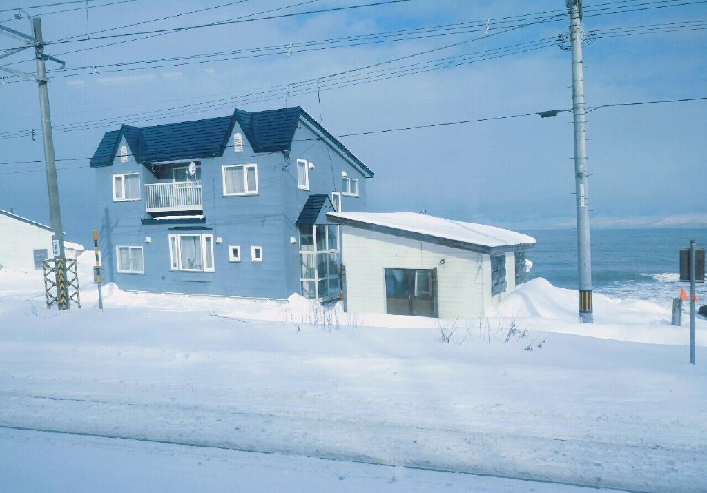 从札幌去小樽的一路上,有一段靠海而行。天气晴朗,雪国列车行驶在海边上,海浪模糊了积雪和大海的分界线。