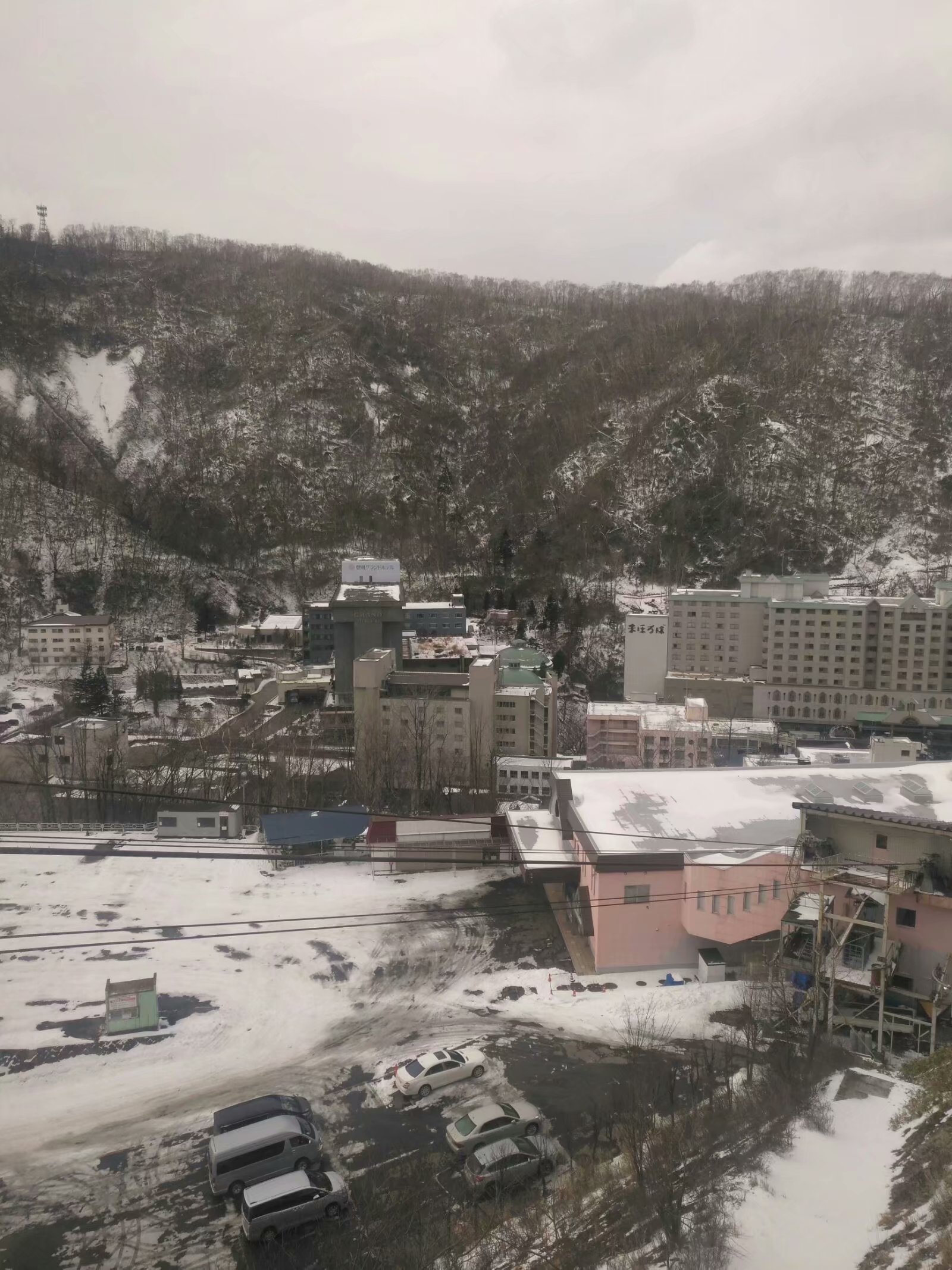 从札幌去洞爷湖的一路上,景色可以说是非常壮丽。一开始,公交行驶在山崖上,一边是峡谷,一边是山。峡谷里的树被雪覆盖,接近傍晚天空突然下起大雪,弥漫的浓雾把大雪变成了粉红色,落在了峡谷里。之后,车开到了开阔地带,路边偶尔有星星点点的屋檐挂着大冰柱的农家,远处是刚驶出的大山,在黄昏的粉雪点缀下,一切都美不胜收。四个小时的行车后,终于来到了目的地——洞爷湖畔的温泉镇。