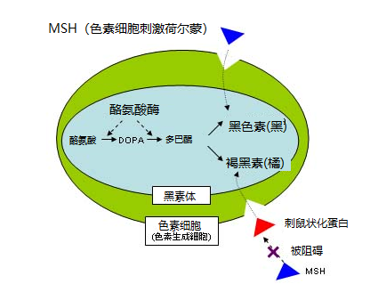 色素生成细胞的表面开着有能让特定的蛋白质进入的孔穴,若被称为MSH(色素细胞刺激荷尔蒙)的蛋白质附着于此,色素细胞就被会被刺激从而合成黑色素。